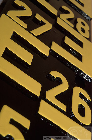 gelbe Bezifferung einer schwarzen, gusseisernen Pegellatte in diagonaler Nahaufnahme