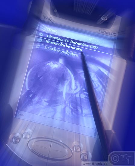 Ein Pocket PC mit Aufgabendisplay "Geschenke besorgen" und Datum 24. Dezember, digital bearbeitet.