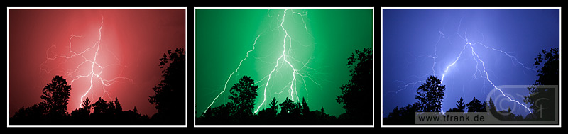 Ein Tryptichon aus drei verschiedenen Blitzen, die hintereinander mit gleichem Bildausschnitt aufgenommen wurden. Spiel mit Wiederholung und Farben.