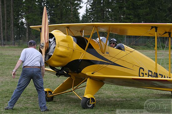 Hier wird gerade der Motor der Bü 133C angerissen. Flugplatzfest auf dem Flugplatz Betzdorf-Kirchen