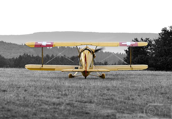 Rückansicht eines Bücker 133 C Jungmeister Doppeldeckers. S/W getont und teilcoloriert (d.h. die Farbe des Flugzeugs ist original und der Hintergrund wurde unter Maskierung des Flugzeugs in Schwarzweiss gewandelt)