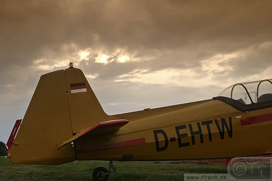 Romantische Wolkenstimmung über dem Heck einer Zlin 526. Damit endete der erste Tag des Wochenendes.