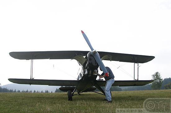 Eine schwarze Bücker 131C Jungmann wird für den Tag vorbereitet. Es ist schon sehr interessant zu sehen, wie morgens die Maschinen für den Tag vorbereitet werden. Da werden Öldosen herumgereicht und verteilt wie anderswo Frühstücksbrötchen ;-)