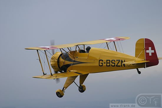 Flugaufnahme der Bücker 133C Jungmeister. Aufgenommen während eines Verbandsflugs aus der Bücker 131 von Georg Wäschenbach. Hier mal zum Vergleich ungetont. Ich ziehe die getonten Varianten allerdings vor - sie verbergen einerseits und nutzen sogar andererseits das trübe Wetter für eine nostalgische und melancholische Stimmung. Flugplatzfest auf dem Flugplatz Betzdorf-Kirchen.