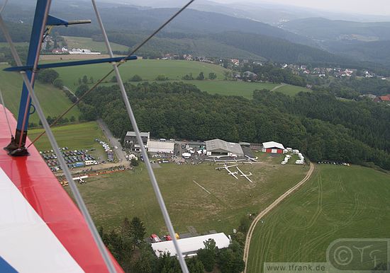 Der Flugplatz Betzdorf-Kirchen aus der Luft gesehen. Ich hätte mir auch wesentlich besseres Wetter gewünscht - so soll diese Aufnahme nur der Vollständigkeit halber hier aufgeführt sein. Die Zuschauerzahl ist aufgrund des Wetters und der Mittagszeit noch nicht sehr hoch - sie nahm gegen Nachmittag noch stark zu. Aufgenommen aus der Casa Bücker 131C von Georg Wäschenbach. Flugplatzfest auf dem Flugplatz Betzdorf-Kirchen