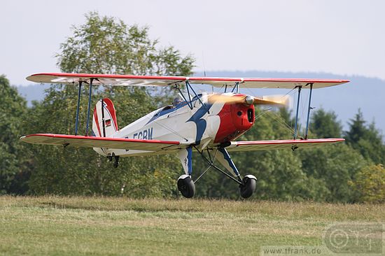 Ein historischer Doppeldecker, die Casa Bücker 131C Jungmann von Georg Wäschenbach, kurz vor dem Aufsetzen. Flugplatzfest auf dem Flugplatz Betzdorf-Kirchen