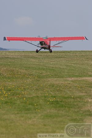 Die Rückansicht einer Aviat Husky A-1 hinter leicht flirrenden Luftschichten am Ende des Rollfeldes.Aufsteigende warme Luft lässt die Konturen in dieser Teleaufnahme leicht flirrend verwischen. Flugplatzfest auf dem Flugplatz Betzdorf-Kirchen