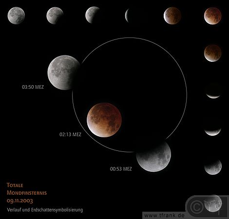 Totale Mondfinsternis am 09.11.2003, beobachtet von Erndtebrück. Composit: Darstellungsversuch des Erdschattens gemäss NASA-Lunar Eclipse Chart, die Bewegungsrichtung des Mondes durch den Erdschatten läuft von unten (SüdWest) nach oben (OstOstNord). Die Bahn des Mondes über den Abendhimmel sah genau umgekehrt aus, dort stand der Mond zu Beginn der Finsternis höher am Himmel als am Ende. Um die Mittelgrafik herum ist der Verlauf der Mondfinsternis von unten rechts beginnend (50% verkleinert) dargestellt.