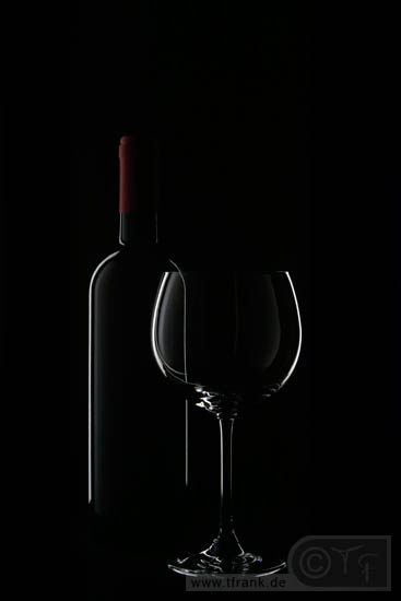 Weinglas und Weinflasche (Rotwein) vor schwarzem Hintergrund nur an den Konturen ausgeleuchtet.