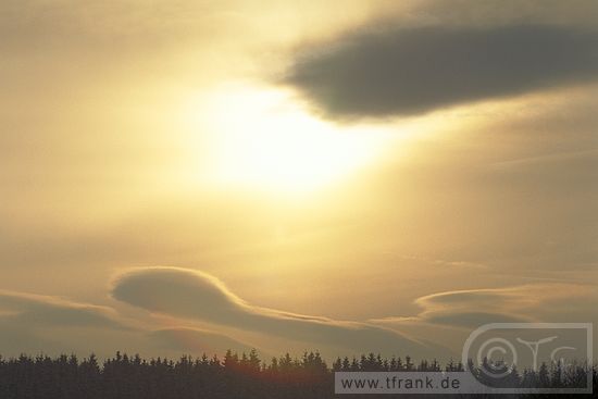 Winterliche Wolken über einem Waldhorizont gegen das Licht der späten Nachmittagssonne.