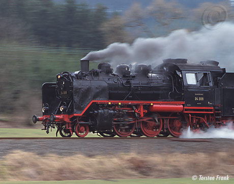 Mitzieher bei der Fahrt entlang der Ederaue auf der Strecke von Erndtebrück nach Bad Berleburg, Dampflok 24 009
